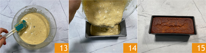Mezcla suavemente con una espátula para incorporarlos de manera uniforme. Engrasa y enharina un molde de plumcake de 22,5x8,5 cm, luego llénalo con la masa obtenida 14. Nivela la superficie y haz un corte longitudinal con un cuchillo engrasado; de esta forma se formará la típica ruptura. Hornea el plumcake en horno estático a 170° durante unos 70-80 minutos. Verifica la cocción con un palillo, luego sácalo del horno y deja enfriar tu plumcake de plátano y arándanos 15 antes de cortarlo en rebanadas y disfrutarlo.