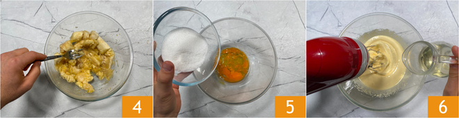Tritura con un tenedor hasta obtener un puré suave 4. En un bol aparte, mezcla los huevos y el azúcar 5, luego trabaja con las varillas eléctricas durante unos diez minutos. Cuando la mezcla esté hinchada y espumosa, vierte el aceite de semillas en hilo manteniendo siempre las varillas en acción 6.