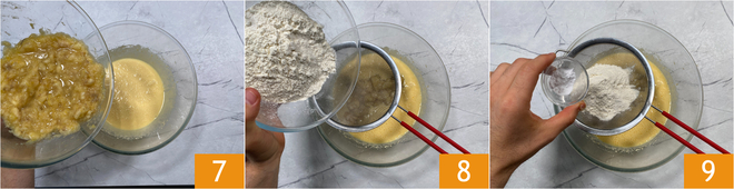 Una vez que el aceite se haya absorbido completamente, incorpora el puré 7, luego tamiza en el bol también la harina 8 y la levadura en polvo 9.