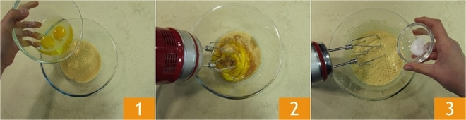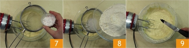 Mantén las varillas en funcionamiento hasta integrar todos los ingredientes, luego añade la levadura y la harina tamizadas a través de un colador 7 8. Mezcla con las varillas durante un par de minutos, hasta que la masa esté bien amalgamada. Termina aromatizando con las semillas de la vaina de vainilla 9.
