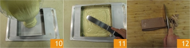 Toma un molde y cúbrelo con papel de horno, coloca encima un molde sin fondo cuadrado de 20x20 cm, asegurándote de engrasar el borde interno. Vierte aquí la masa 10, nivela la superficie con una espátula 11 y hornea en un horno estático precalentado a 180º durante 30 minutos en la bandeja del medio. Mientras tanto, pica el chocolate para el relleno 12.
