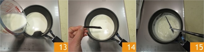 Vierte en un cazo la nata líquida fresca 13 y la vaina de vainilla sin semillas 14, lleva a ebullición y luego elimina la vaina 15.