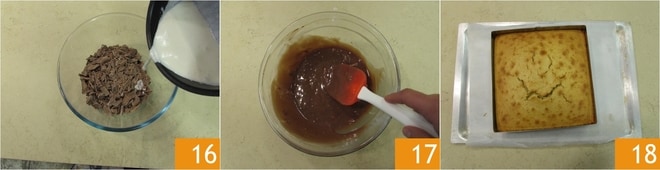Vierte la mezcla caliente en el tazón con el chocolate picado 16 y mezcla hasta obtener una salsa homogénea 17 que reservarás. Mientras tanto, la base habrá terminado la cocción, sáquela del horno 18. Si durante la cocción el centro del pastel se ha inflado un poco, no te preocupes, voltea el pastel y déjalo enfriar.