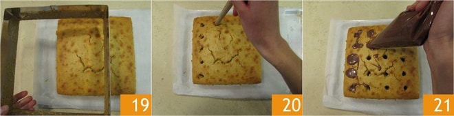 Extrae el molde 19, luego con el mango de una cuchara perfora el pastel 20 para crear 20 agujeros bien distribuidos. Rellena los agujeros con la ganache de chocolate ayudándote con una manga pastelera 21.