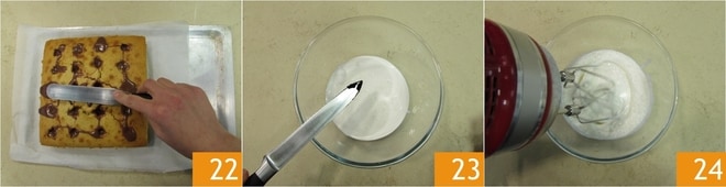 Con una espátula nivela la superficie para eliminar el exceso de ganache 22. Ahora ocúpate de la decoración, vierte la nata fresca líquida en un tazón, sazona con las semillas restantes de la vaina de vainilla 23 y monta la nata con las varillas eléctricas (asegúrate de que las varillas estén bien limpias) 24 hasta que esté bien espumosa.