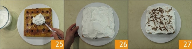 Cubre el pastel con la nata montada 25, creando un efecto ondulado con suaves espatuladas 26. Espolvorea la superficie con chocolate finamente picado 27.