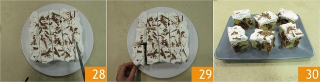En este punto, corta el pastel primero en 5 tiras verticales 28 y luego en 3 horizontales 29, para obtener 15 piezas. Si lo prefieres, también puedes hacer cubos más pequeños. ¡Sirve tu poke cake 30!
