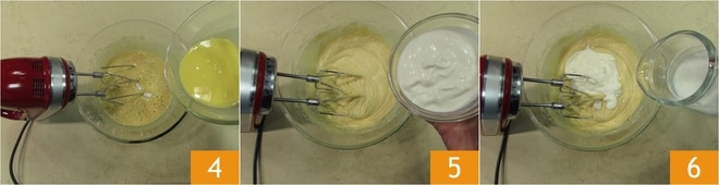 Agrega la mantequilla derretida y enfriada 4 y sigue batiendo hasta obtener una mezcla esponjosa y clara; en este punto incorpora el yogur 5 y la leche 6.