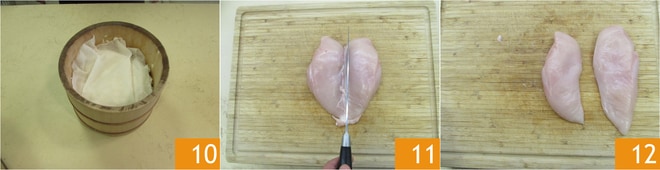 Mezclad de tanto en tanto hasta que el arroz esté frío. Cubrid con un paño húmedo, para que no se pegue, y reservad 10. Pasad al pollo, eliminad las partes de cartílago. Cortad la pechuga de pollo en dos partes 11, para obtener dos filetes gruesos 12.