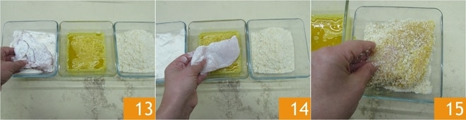 En un bol batid los huevos con un poco de sal y pimienta. Pasad la pechuga de pollo primero por la harina 13, luego por el huevo 14 y después por el panko 15. Haced luego un doble empanado pasando el pollo nuevamente por el huevo y otra vez por el panko.