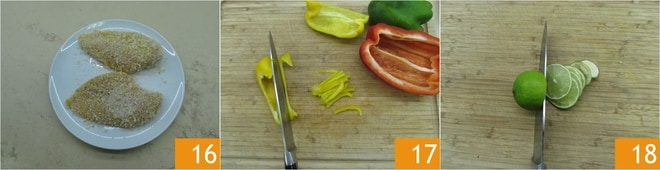 Transferid a un plato y preparad del mismo modo el segundo filete. Poned a calentar abundante aceite de semillas hasta alcanzar una temperatura de 170°. Mientras tanto, cortad los pimientos en tiras 17, asegurándoos de haber eliminado bien las semillas y los filamentos internos. Cortad también la lima en rodajas 18.