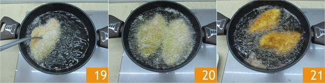 Freíd la pechuga de pollo en el aceite caliente (170°) 19 durante unos 10 minutos, bajando el fuego una vez que se sumerja la pechuga de pollo 20. De esta manera, la pechuga de pollo se cocinará bien también por dentro. Transcurridos los 10 minutos, deberá estar bien dorada 21.