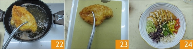 Utilizando unas pinzas, extraed el pollo del aceite 22, colocadlo en una bandeja con papel absorbente 23 y cortadlo en rodajas. Ahora podéis componer vuestro poke de pollo. Colocad el arroz en la base, poned encima los pimientos, las rodajas de lima, los brotes de rábano, los anacardos picados y semillas de sésamo mixto. Condimentad con la salsa ponzu y el Poke de pollo está listo 24.