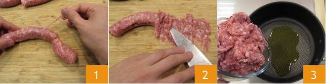 Para preparar la polenta con salchicha y queso, lo primero que deben hacer es ocuparse del ragú: retiren la tripa de la salchicha 1, luego desmenucen la carne con un cuchillo 2. Calienten un poco de aceite de oliva en una cazuela de borde alto, añadan la salchicha 3,