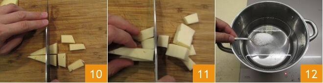 Ahora ocúpense de la polenta: corten en cubos la fontina 10 y la toma 11. Pongan al fuego una olla de acero de fondo grueso, añadan el agua y, cuando comience a rozar el hervor, salen 12