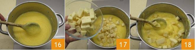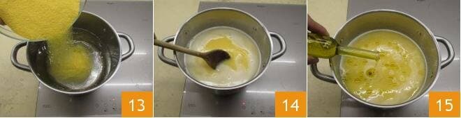 y añadan la harina de maíz en forma de lluvia 13. Mantengan la cocción a alta temperatura mezclando rápidamente 14. Añadan también el aceite de oliva que evitará la formación de grumos 15, continúen cocinando por 50 minutos a fuego lento mezclando continuamente, prestando atención a que la polenta no se pegue al fondo.