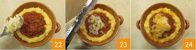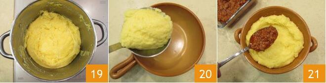 La polenta está lista 19: tomen 4 cuencos de barro aptos para el horno, si desean preparar porciones individuales, o usen una única fuente grande, añadan un cucharón abundante de polenta 20, condimenten con un par de cucharadas de ragú 21,