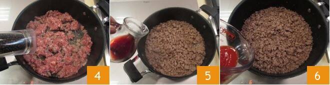 pimienten 4 y dejen dorar por 3-4 minutos. Tan pronto como la salchicha haya tomado color, desglasen con el vino tinto 5, dejen evaporar el alcohol, luego añadan el puré de tomate 6