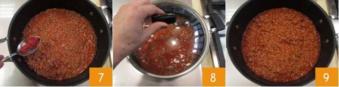 y el concentrado 7. Mezclen con una cuchara, cubran con la tapa 8 y cocinen por 15 minutos o el tiempo necesario para reducir la salsa; una vez listo, manténganlo caliente 9.