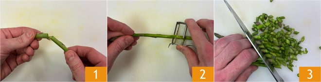 Para preparar la polenta con verduras primaverales, lo primero que debes hacer es eliminar la parte más leñosa del tallo de los espárragos 1. Pela lo que queda del tallo 2 y córtalo en pequeñas rombos 3, reservando las puntas.
