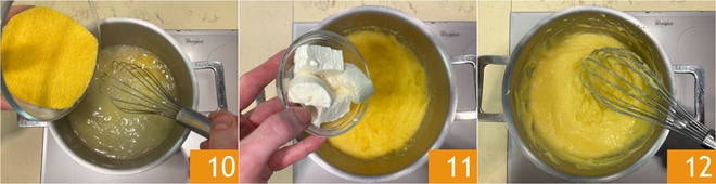 Para preparar la polenta, lleva a ebullición el agua salada, luego vierte en forma de lluvia la harina de maíz 10 y mezcla continuamente con una varilla, durante 5 minutos o hasta que esté espesa. Apaga el fuego, añade el stracchino 11 y mezcla hasta que la polenta esté fundente 12.