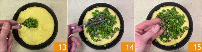 Coloca en un plato para servir una cucharada generosa de polenta, luego añade en el centro el condimento 13 y las puntas de espárrago 14. Aromatiza con algunas hojas de tomillo 15.