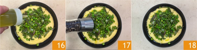 Completa con un chorrito de aceite en crudo 16 y una pizca de pimienta 17. Tu polenta con verduras primaverales está lista para ser servida 18