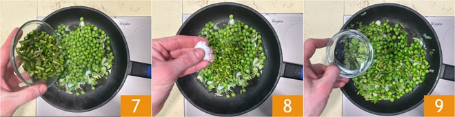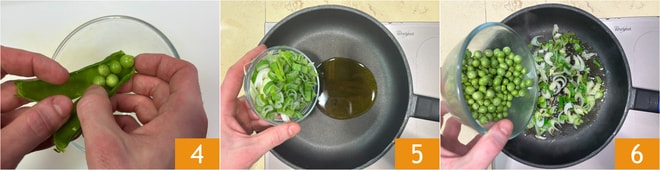 Desgrana los guisantes 4. Corta la cebolleta por la mitad, luego en rombos, ponla en una sartén antiadherente con un chorrito de aceite 5 y sofríe durante 3-4 minutos. Luego añade los guisantes 6.