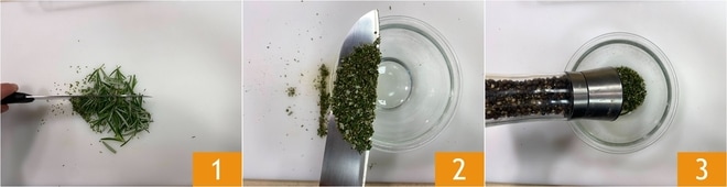 Para preparar el pollo asado con verduras torneadas, como primer paso coloca sobre una tabla de cortar el tomillo y el romero. Pícalos finamente 1 y transfiérelos a un cuenco pequeño 2, luego añade la pimienta 3.