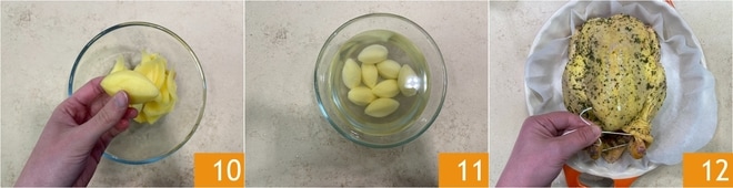 Deberás obtener una forma redondeada con los extremos en punta 10. A medida que las termines, colócalas en un cuenco con agua para que no se ennegrezcan 11. Luego coloca el pollo en una fuente para horno y ata las patas entre sí con hilo de cocina 12.