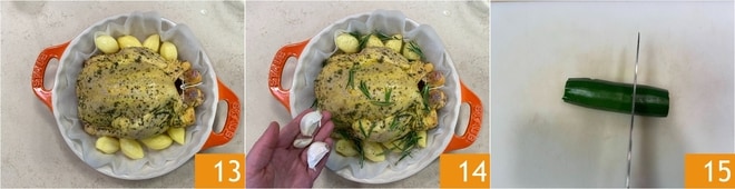 Coloca alrededor las patatas 13, sazona con un poco de aceite, sal y pimienta (solo en las patatas) y añade los dientes de ajo con piel 14. Cocina en horno estático precalentado a 200° durante 60 minutos. Mientras tanto, prepara las otras verduras: lava las zanahorias y los calabacines, luego córtalos en trozos 15.