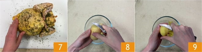 Masajéalo bien para que los sabores penetren de manera uniforme 7, luego unge la superficie. Pasa a las patatas: pélalas 8 y tornea con un cuchillo pequeño 9.