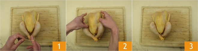Para preparar el pollo asado, primero ata el pollo de manera que mantenga su forma después de la cocción. Toma una goma elástica para horno, pásala alrededor de la parte final de los muslos 1, estírala y pásala por detrás del pecho 2, para mantenerlo firme 3.