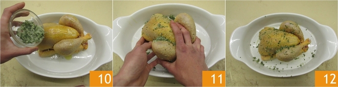 Cubre con la mezcla aromática 10, masajeando con ambas manos por todos los lados para que se adhiera bien 11. Condimenta también el interior del pollo con la mezcla aromática 12.