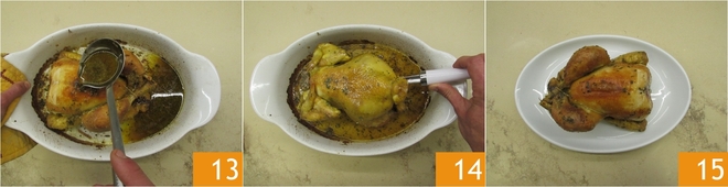 Cocina el pollo en horno estático precalentado a 180° durante aproximadamente una hora. De vez en cuando, baña el pollo con su fondo de cocción 13. A mitad de cocción, saca el pollo del horno y dale la vuelta al otro lado 14, para que la cocción sea uniforme en ambos lados. Continúa la cocción, bañando el pollo de vez en cuando con el fondo. Pasado el tiempo de cocción, saca del horno y sirve tu pollo 15. Para asegurarte de que esté bien cocido puedes medir la temperatura en el centro del muslo, deberá ser de 72°.