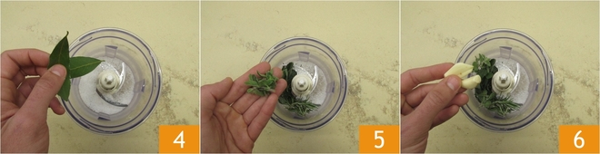 Vierte en una batidora la sal gruesa, añade el laurel 4 y las otras hierbas aromáticas: romero, salvia y orégano fresco 5. Agrega también 2 dientes de ajo pelados 6.