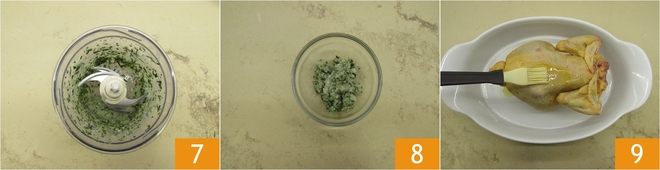 Tritura todo 7 y transfiere la mezcla a un bol pequeño 8. Toma el pollo y colócalo en una fuente para horno. Cepilla o masajea la superficie del pollo en ambos lados con aceite de oliva virgen extra 9.