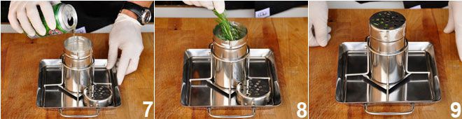 Una vez encendidas las brasas, se cierra la tapa y se actúa sobre las tomas de aire para estabilizar la temperatura. Alcanzada la temperatura deseada, se puede iniciar la cocción del Beer Can Chicken. Primero se lanzan las chips directamente sobre las brasas a través de una ventanita presente en la parrilla de los alimentos. Se levanta la ventanita y con una pinza para barbacoa se colocan las chips para que se quemen 12. Será necesario insertar una cantidad mínima de chips, todas las que quepan en una mano para entendernos. Se cierra nuevamente la tapa y se espera a que las chips de madera aromática comiencen a producir humo.