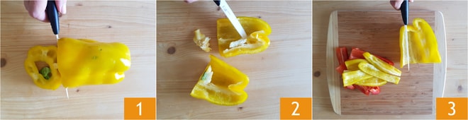 Para preparar el pollo con aceitunas y pimientos, lava y seca los pimientos, luego quita la parte superior para eliminar el tallo 1, pártelos por la mitad a lo largo, elimina las semillas internas y los filamentos blancos con un cuchillo afilado 2. Corta cada mitad de los pimientos en tiras de aproximadamente 1 cm y medio de ancho 3