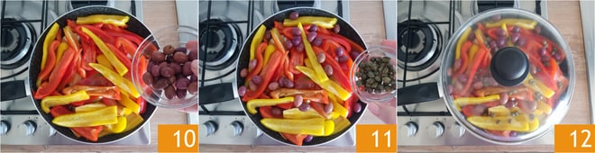 Añade también las aceitunas 10 y las alcaparras 11, cubre con una tapa 12 y deja cocinar a fuego lento durante 15 minutos.