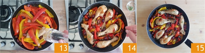 Ajusta de sal, sazona con una pizca de pimienta 13, cubre con la tapa y completa la cocción agitando de vez en cuando la sartén, tomará unos 30 minutos. En este punto retira la tapa, sube un poco el fuego y cocina otros 5 minutos para espesar un poco el fondo y dar sabor a todo, completa con hojas de mejorana y orégano fresco 14. Sirve enseguida el pollo con aceitunas y pimientos 15.