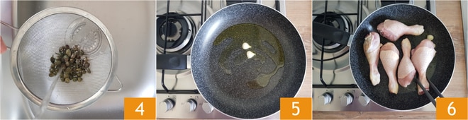 Desala las alcaparras enjuagándolas bajo agua corriente 4. Pon un poco de aceite en una sartén grande, añade los dientes de ajo pelados 5 y calienta a fuego lento, añade los muslos de pollo 6 y también a fuego lento dóralos por ambos lados girándolos con unas pinzas de cocina (tomará unos 8 minutos).
