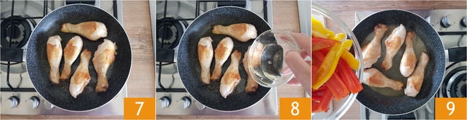 Cuando los muslos de pollo estén bien dorados 7 añade el vino blanco 8 y deja que se evapore, elimina el ajo. En este punto añade los pimientos en tiras 9 y el agua caliente.