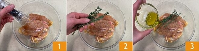 Para preparar el pollo con coliflor y salsa de mostaza, lo primero es marinar la carne: poned las pechugas de pollo en un bol, y añadid sal, pimienta 1, las ramitas de tomillo 2 y el aceite 3.