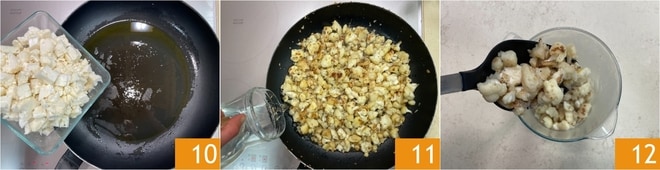 En la misma sartén, calentad otro chorrito de aceite y añadid la coliflor picada groseramente 10. Salpimentad y rehogad a fuego medio, cuidando de no quemarla. Cuando esté dorada, cubrid con agua 11 y continuad cocinando durante 5-6 minutos, hasta que se deshaga. En este punto, transferid la coliflor a una jarra 12.