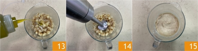 Verted un chorrito de aceite 13 y triturad con una batidora de mano 14 para obtener una crema lisa y homogénea 15.