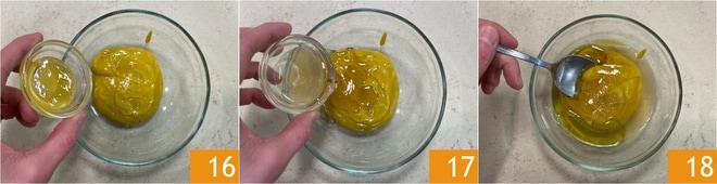 Manteneos la crema de coliflor caliente y pasad a la salsa de mostaza: en un bol pequeño, unid la mostaza, la miel 16, el vinagre de manzana 17, el aceite y una pizca de sal. Emulsionad bien la mezcla 18 y reservad.