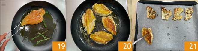 Ahora retomad las pechugas de pollo: verted el aceite de la marinada en una sartén junto con las ramitas de tomillo, luego colocad las pechugas de pollo con la piel hacia abajo 19 y cocinad a fuego medio-alto durante 4-5 minutos, o hasta que esté bien dorada y crujiente. Girad las pechugas de pollo y cocinad un par de minutos también del otro lado 20. Una vez listas, transferid las pechugas de pollo a la bandeja donde habíais puesto las rodajas de coliflor 21.