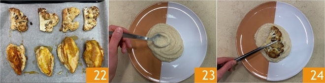 Hornead todo en modo ventilado a 200° durante 5 minutos 22. Estáis listos para emplatar: extendid la crema de coliflor en la base del plato 23, luego añadid una rodaja de coliflor asada 24.