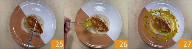 Colocad encima la pechuga de pollo 25 y adornad con la salsa de mostaza 26. Finalmente, completad con algunas hojitas de tomillo fresco. ¡Vuestro pollo con coliflor y salsa de mostaza está listo para ser servido 27!